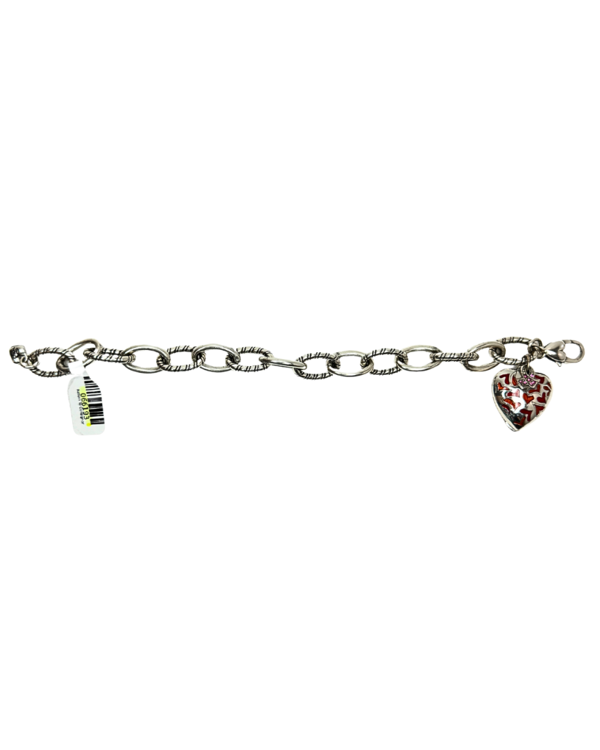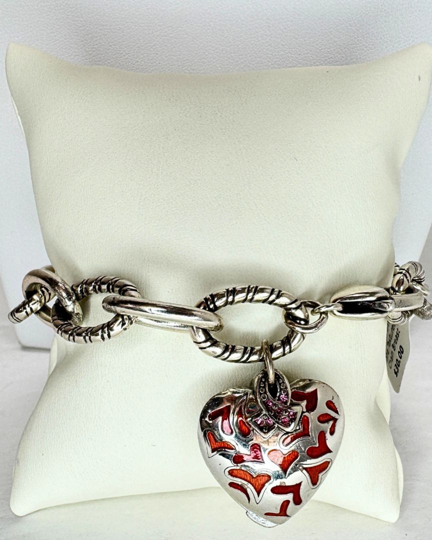 Brighton Silver Tone Textured Chain Breast Cancer Heart Charm Bracelet Red Orange Pink